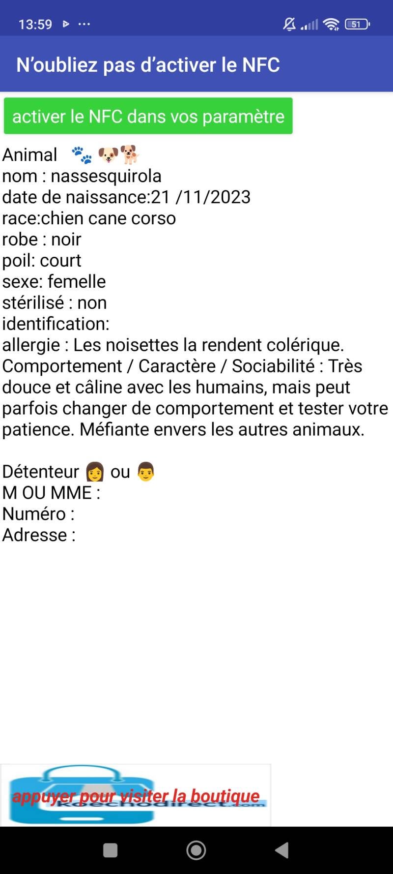 Vérifier s’il a un médaillon NFC, S’il porte un médaillon Ko ec-h-o Direct, il vous suffit d’activer le NFC dans les paramètres de votre téléphone ou d’installer l’application KoechoDirect depuis le Google Play Store.